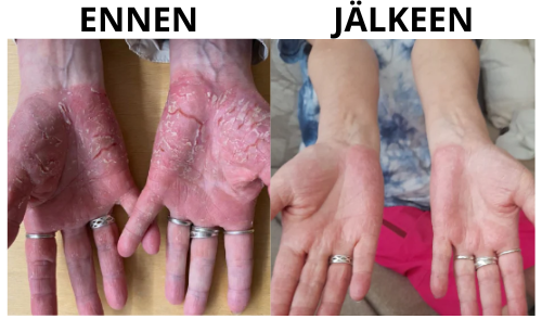 Päivi Kinnunen Joensuusta kärsi vuosia iho-ongelmasta kämmenissä, joista otettiin 6 kertaa koepala. Hän on kokeillut useita lääkeaineita muun muassa kortisonia ja antibiootteja, jotka eivät tuoneet toivottavaa tulosta. Scandinavian Derma Cream voiteen ansiosta vain viikon käytön jälkeen hänen ihonsa parantui täydellisesti.